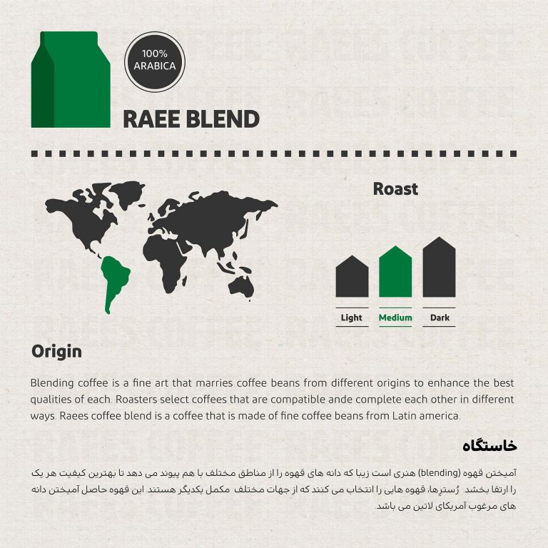 آمیختن قهوه (Blending) هنری است زیبا که دانههای قهوه را از مناطق مختلف با هم پیوند میدهد تا کیفیت هر یک را ارتقا بخشد. رسترها قهوههایی را انتخاب میکنند که از جهات مختلف مکمل یکدیگر هستند. قهوه رئیس بلند حاصل آمیختن دانههای مرغوب آمریکای لاتین است.